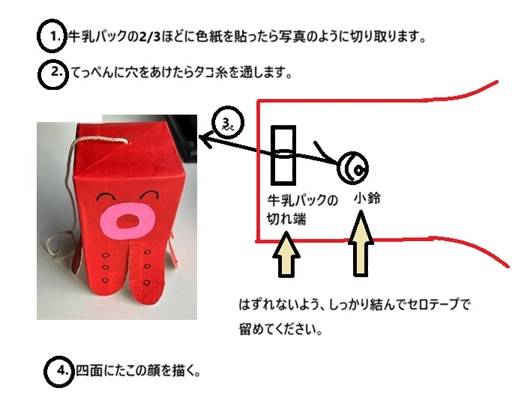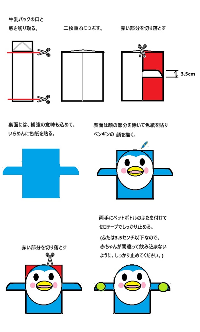 500mlの牛乳パックで作ってみました(写真)。 ペットボトルのフタは 3.5cm×3.5cm以下なので 赤ちゃんが飲み込まないように、要注意ですね。 |