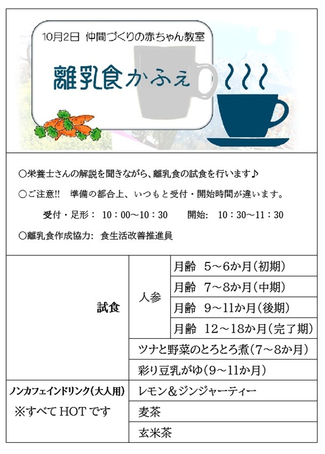 後日記 豆乳がゆ、おいしかった~~ 栄養士の先生や食生活改善員のかたがたの頑張り もあり、なごやかなうちに閉幕となりました。 おかげさまで参加者の皆様の楽しかった、との お声をいただきスタッフ一同、ほっとしており ます。来年はどんな出会いがあるかな ? 0歳児限定だけど、2人め3人めのお子さんと いっしょに、また来てね。